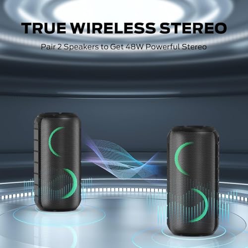 【 24 HOURS PLAYTIME 】Portable speaker provides up to 24 hours of playback in light-off mode at 50% volume. Fast USB-C recharge makes continuous play possible. Note: the playback time is affected by the lighting mode and the volume level.