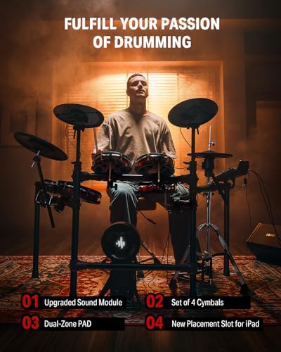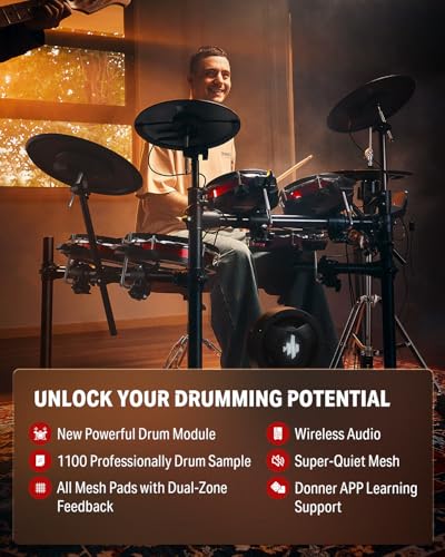 Specification: Donner Electric Drum Set DED-300 Pro, Electronic Drum Kit Adult, Professional Full Size 6-Drum & 3-Cymbal Setup, 12” Single-Zone Hi-hat with Stand, 1100+ Professional Tones, Gifts for Men Him Teens