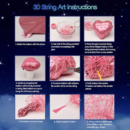 All-Inclusive DIY Craft Set – Includes 6 balloon shapes (2 each: heart, moon, star), 3 vibrant string colors, 3 tassel colors, 6 mini LED lights, glue, gloves & mounting accessories. Everything your child needs to build glowing 3D art!