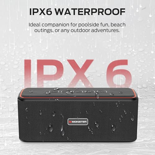 【 15H Playtime & IPX6 Water Resistant 】Keep the music going all day long with an impressive 15-hour playtime on a single charge. Designed for the on-the-go lifestyle, the Monster portable speaker ensures you never run out of power during your adventures. Additionally, the IPX6 water-resistant rating means it can withstand splashes, rain, and even accidental spills, making it perfect for outdoor activities like hiking, camping, or beach trips.