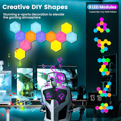 Pak Hexagon Lights 9 Packs DIY LED Light, RGB+IC Creative Gaming Lights Wall Décor with Remote, with APP Smart Modular Panel Hex Tiles, Push Glide Expansion Shape with Music Sync, Voice Control