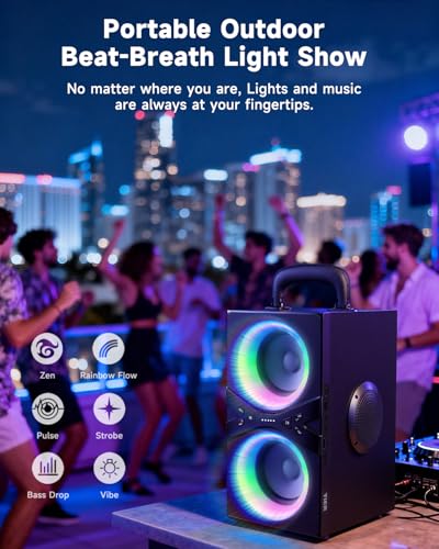 Dynamic RGB Light Show:More than just a wireless speaker, it’s an atmosphere maker! Six dazzling RGB lighting modes, including a unique beat-based function, instantly transform any space into a dazzling stage. The lights can be turned off with a single click, adapting to any occasion. This outdoor Bluetooth speaker is not only an auditory feast, but also a visual focal point, doubling the excitement of your outdoor gatherings and parties.