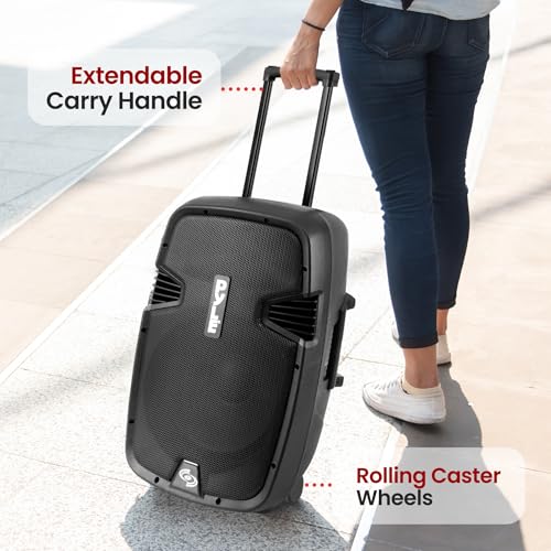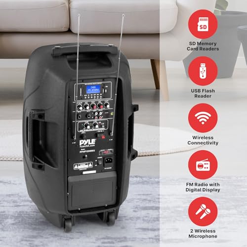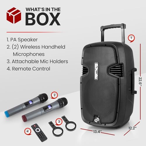 Pyle Portable Bluetooth PA Speaker System – 1000W Wireless Karaoke Loudspeaker with 12” Subwoofer, USB/SD/MP3/FM – Includes Dual UHF Mics, Remote, Rolling Wheels – Ideal for Parties, Events, Outdoors