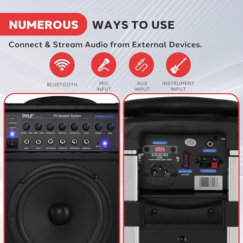The Pyle PWMA230BT provides wireless and portable PA loudspeaker mobile entertainment. This versatile system was designed with quick audio setup in mind. Bluetooth streaming ability and built-in rechargeable battery give you wireless freedom, while the telescoping handle and rolling caster wheels allow for quick transport. Stream music from all of your favorite devices (like an iPhone, Android, Smartphone, iPad, Tablet, Computer, etc.). Use the included wireless microphone with the high-powered speaker system to control the crowd which makes it perfect for on-stage events, concerts or school auditoriums. Your message, or music, will be heard loud and clear thanks to the full-range stereo sound system. Additional 1/4” microphone inputs allow for multiple people to communicate through the system, along with additional guitar / instrument input support for musical performances. Additional features include ported enclosure for increased bass response, adjustable sound configuration controls, 35mm universal speaker stand mount, external 12V power input and more! Enjoy hours of wireless PA speaker performance with the Pyle PWMA230BT Bluetooth Speaker System.
