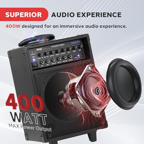Pyle Wireless Portable PA System-400W Bluetooth Compatible Rechargeable Battery Powered Outdoor Sound Stereo Speaker Microphone Set w/Handle, Wheels-1/4 to AUX, RCA Cable (PWMA230BT)