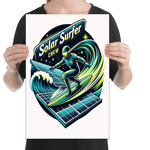 Transform your space with this vibrant 13×19-inch poster print celebrating the unique fusion of retro surf culture and renewable energy. The striking design features a solar technician riding cosmic panels, beautifully rendered in teal and yellow risograph inks on premium archival paper. This landscape-oriented wall art makes a bold statement in any room with its eye-catching colors and distinctive aesthetic. Perfect for brightening workshops, offices, classrooms, bedrooms, or man caves, this unframed poster serves as both captivating decor and a conversation starter. The lightweight, fade-resistant print arrives ready to frame, allowing you to customize its presentation to match your existing decor. Measuring 13×19 inches, this large-format poster provides substantial visual impact while remaining versatile enough for various display options. Crafted with quality materials on glossy photo paper, this distinctive piece brings together playful imagery with forward-thinking themes. Whether displayed in your family room, home office, playroom, or kitchen, this unique wall art adds character and vibrant energy to any interior space.