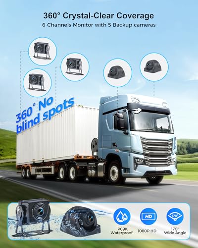 6-channel 10.1″ HD Monitor: Experience crisp, clear visuals with our 6-channel 10.1 inch HD IPS screen. Display and record 1080P video from all 5 cameras simultaneously, easily find and playback recorded videos with the intuitive touch interface. Our semi truck camera system offers unmatched clarity and functionality, whether navigating new areas or monitoring surroundings
