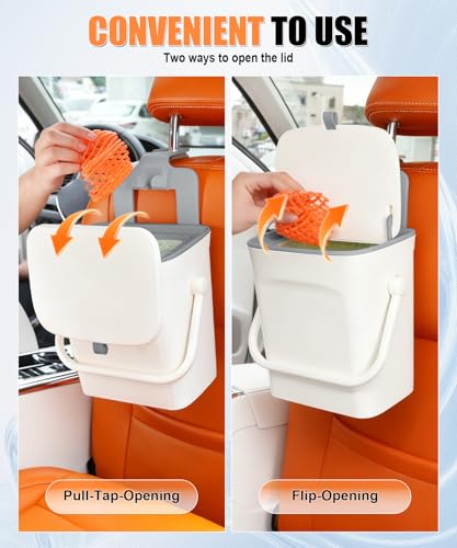 【Practical Design】With practical designs, the car trash bin is convenient for every passenger. Front seat users slide the lid; back seat users just flip it open—no stretching, so throwing trash into the garbage can is hassle-free wherever you sit. A soft silicone handle ensures smoother lid operation—no sticking or struggle, just a quick, easy flip or slide every time. Plus, the tight seal locks in food odors, keeping your car fresh even when it’s full