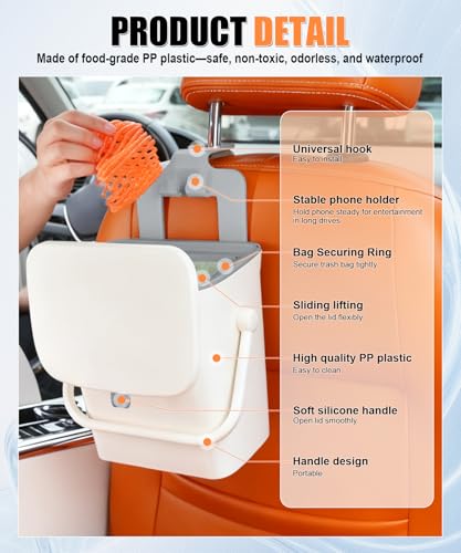 Specification: SINGARO Car Trash Can with Lid and Phone Holder, Universal Trash Bin, Waterproof Hanging Vehicle Garbage Can, Leak Proof Organizers and Storage, Car Accessories Interior for Women Men, White