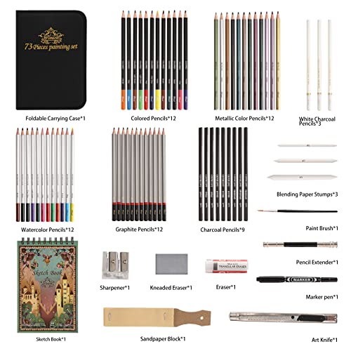 Specification: Tioucd 73 Pcs Drawing Kit – Professional Art Supplies Drawing Set with Graphite, Charcoal, Colored Watercolor, Metallic Pencils, Sketchbook for Drawing – Arts Set for Adults Teens Artists Beginners