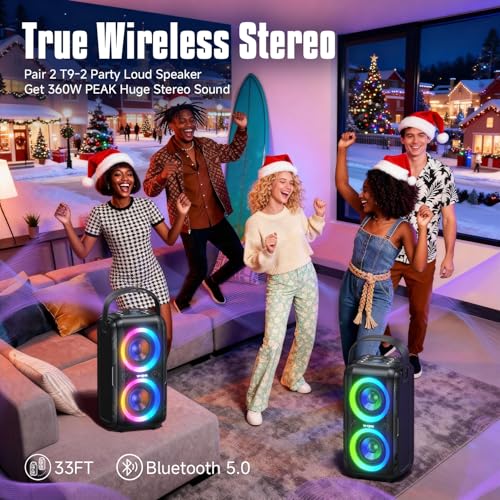 360W PEAK WIRELESS STEREO PAIRING & IPX5 SPLASHPROOF: The powerful long-life battery allows your large outdoor speakers to play 24H. Bluetooth wirelessly pairs 2 T9-2 portable speakers to create a true wireless stereo two-channel system to deliver 160W RMS of true stereo sound(T9-2 cannot be paired with T9). The T9-2 is IPX5 splashproof so you never have to worry about the party getting wet and wild. Please use the 5V/2A power adapter to charge the waterproof Bluetooth speaker(not included).
